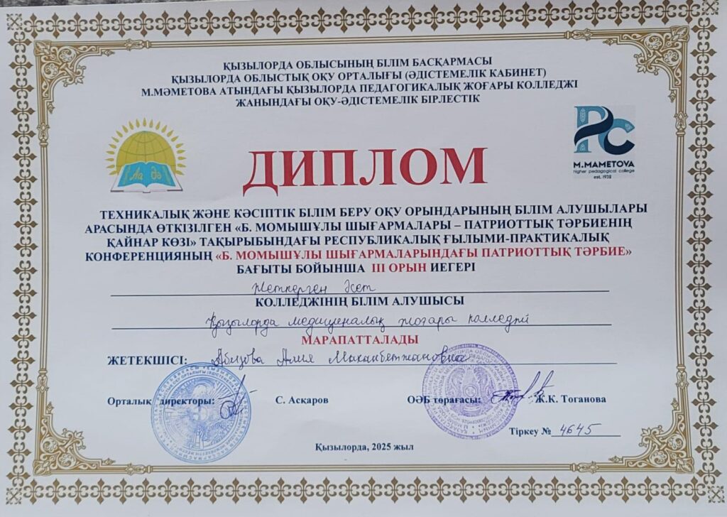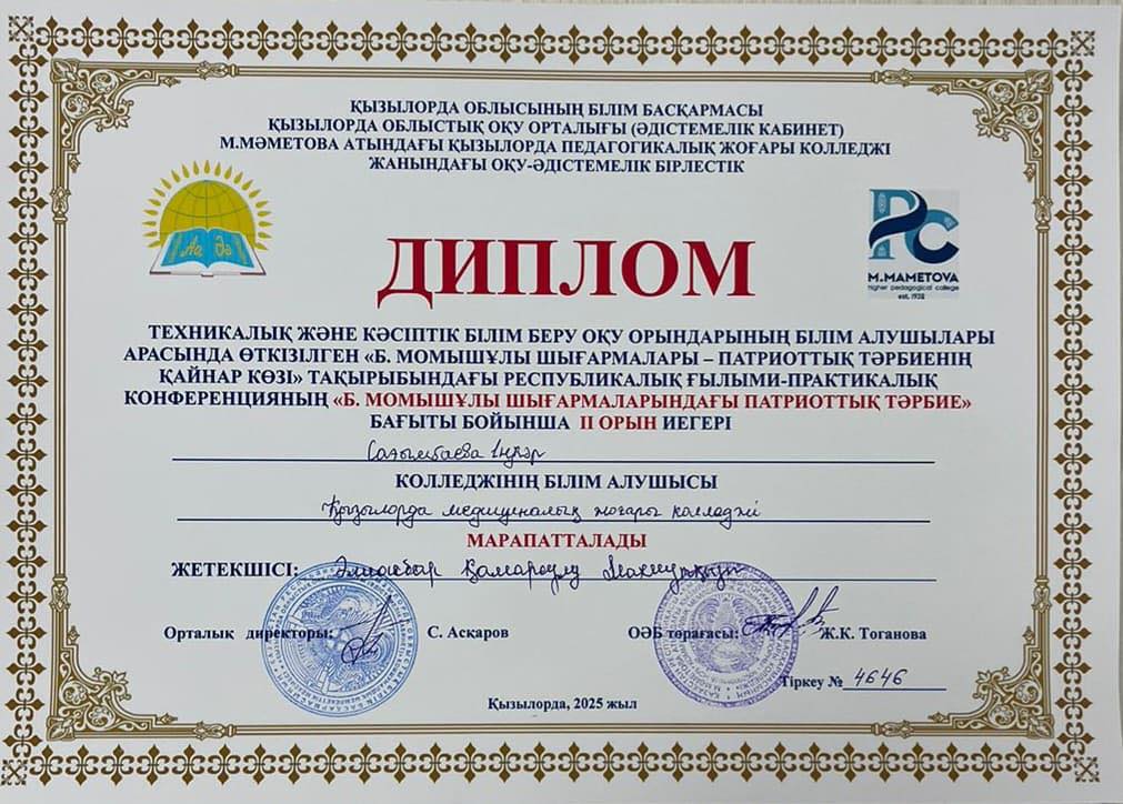Аталған конференцияға Қызылорда медициналық колледжінің 1-курс студенттері «Б.Момышұлы шығармаларындағы патриоттық тәрбие» бағыты бойынша қатысып, жүлделі орындарға ие болды.